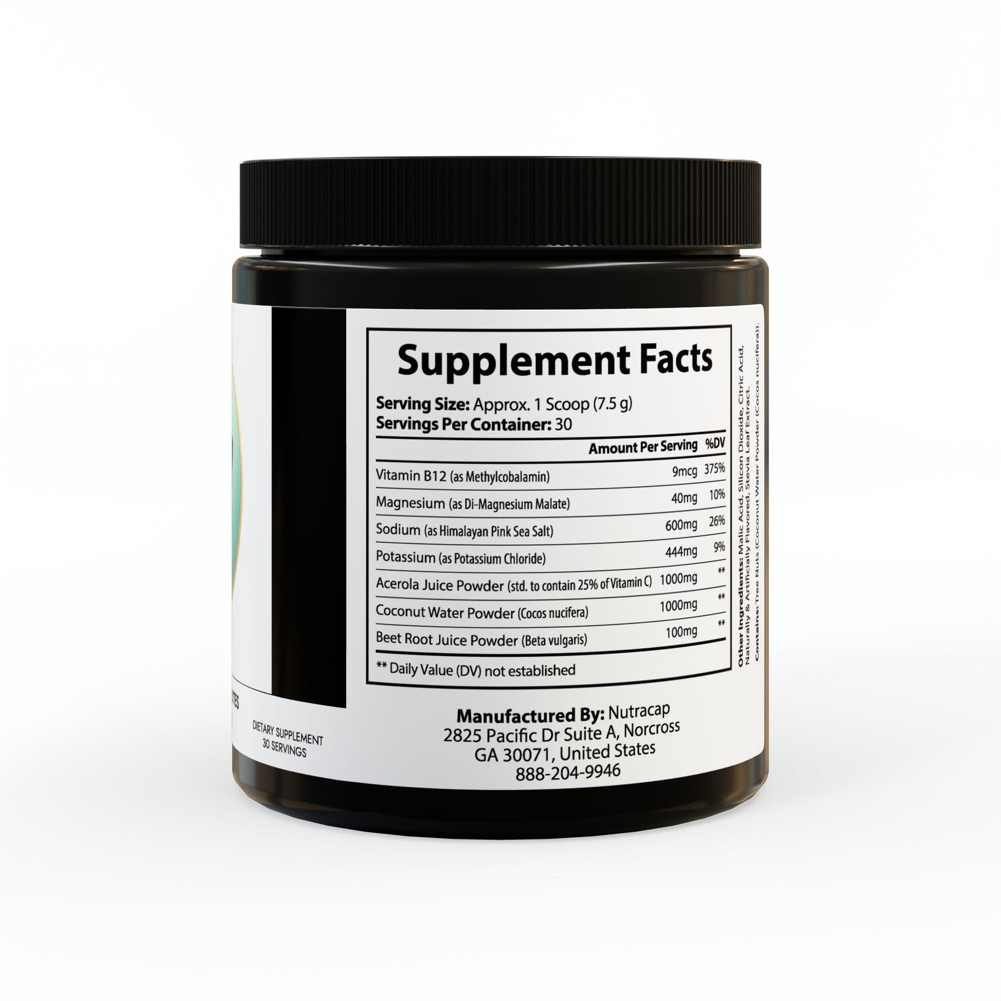 Key ingredients include Vitamin B12, Magnesium, Sodium (as Himalayan Pink Sea Salt), Potassium, Acerola Juice Powder (standardized to contain 25% Vitamin C), Coconut Water Powder, and Beet Root Juice Powder.