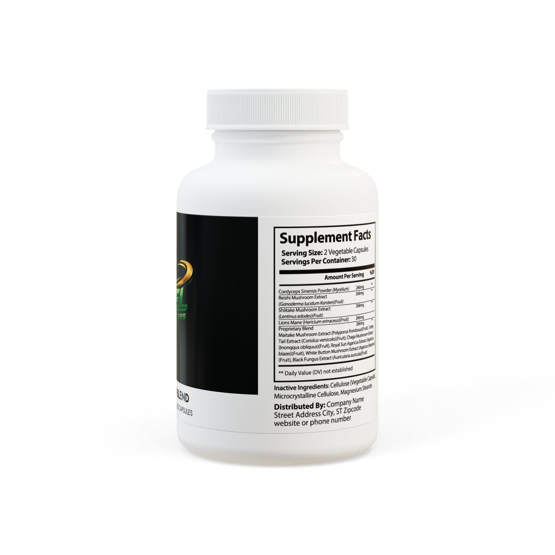 Ingredients: Cordyceps Sinensis Powder (Mycelium), Reishi Mushroom Extract, (Ganoderma lucidum Karsten)(Fruit), Shiitake Mushroom Extract, (Lentinus edodes)(Fruit), Lions Mane (Hericium erinaceus)(Fruit), Proprietary Blend, Maitake Mushroom Extract (Polyporus frondosus)(Fruit), Turkey Tail Extract (Coriolus versicolor)(Fruit), Chaga Mushroom Extract, (Inonqqus obliquus)(Fruit), Royal Sun Agaricus Extract (Agaricus blazei)(Fruit), White Button Mushroom Extract (Agaricus bisporus), (Fruit), Black Fungus Extract (Auricularia auricula)(Fruit), Cellulose (Vegetable Capsule), Microcrystalline Cellulose, Magnesium Stearate.