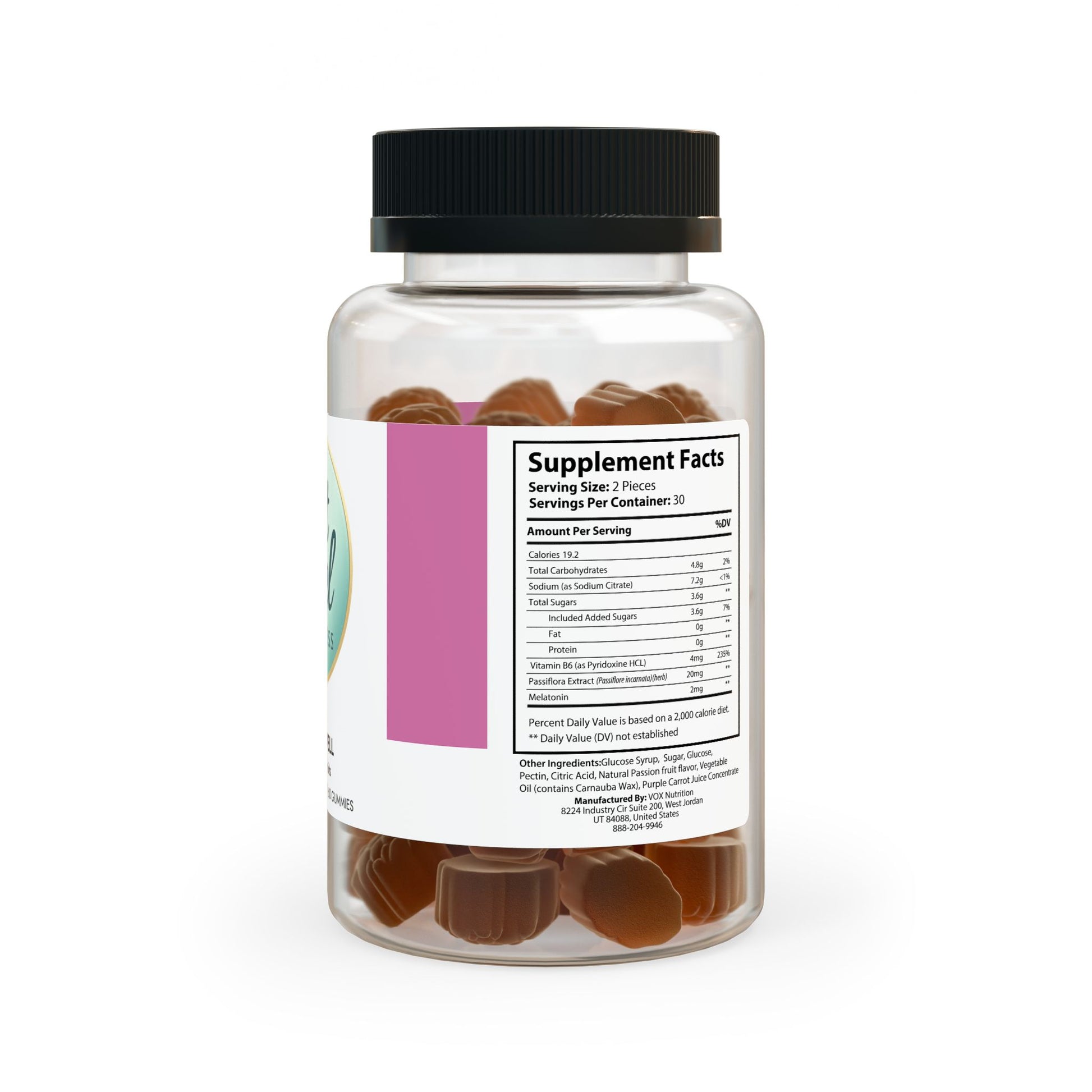 Ingredients: Sodium (as Sodium Citrate), Vitamin B6 (as Pyridoxine HCL), Passiora Extract (Passiore incarnata)(herb), Melatonin. Other Ingredients: Glucose Syrup, Sugar, Glucose, Pectin, Citric Acid, Natural Passion fruit avor, Vegetable Oil (contains Carnauba Wax), Purple Carrot Juice Concentrate